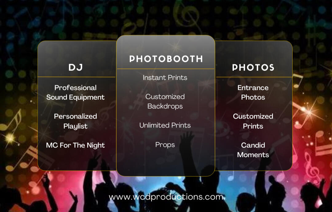 Our pricing for photobooth, DJ, photography, and videography services is determined by factors such as event duration, number of guests, travel distance, and any special requests or customizations. Contact us for a tailored quote to perfectly suit your event needs.